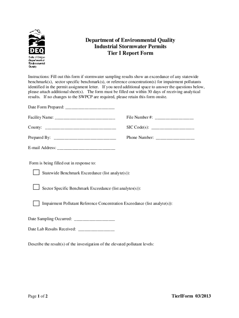 Department of Environmental Quality Industrial Stormwater Permits Tier I Report FormInstructions: Fill out this form if stormwater sampling results show an exceedable of any statewide benchmark(s),