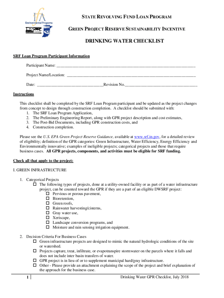 STATE REVOLVING FUND LOAN PROGRAM GREEN PROJECT RESERVE SUSTAINABILITY INCENTIVE DRINKING WATER CHECKLIST SRF Loan Program Participant Information Participant Name: ___ Project Name/Location: ___