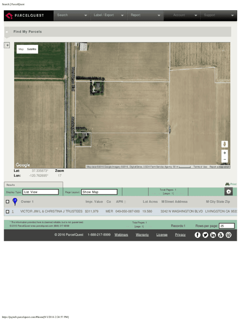 Search | ParcelQuestSearchLabel / ExportReportAccountSupportFind My ParcelsMapSatelliteMap data 2016 Google Imagery 2016, DigitalGlobe, USDA Farm Service Agency 50 meat: Lon:37.335873 120.762695Terms
