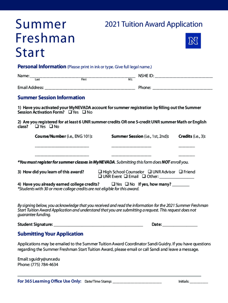 Summer Freshman Start2021 Tuition Award ApplicationPersonal Information (Please print in ink or type. Give full legal name.) Name: ___ SHE ID: ___ LastFirstM. I. Email Address: ___ Phone: ___Summer