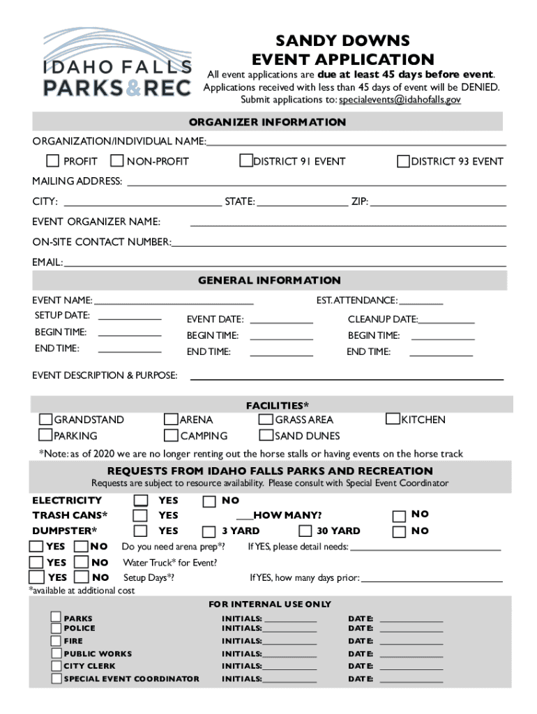 SANDY DOWNS EVENT Application event applications are due at least 45 days before event. Applications received with less than 45 days of event will be DENIED. Submit applications to: special events×Idahoans.gov