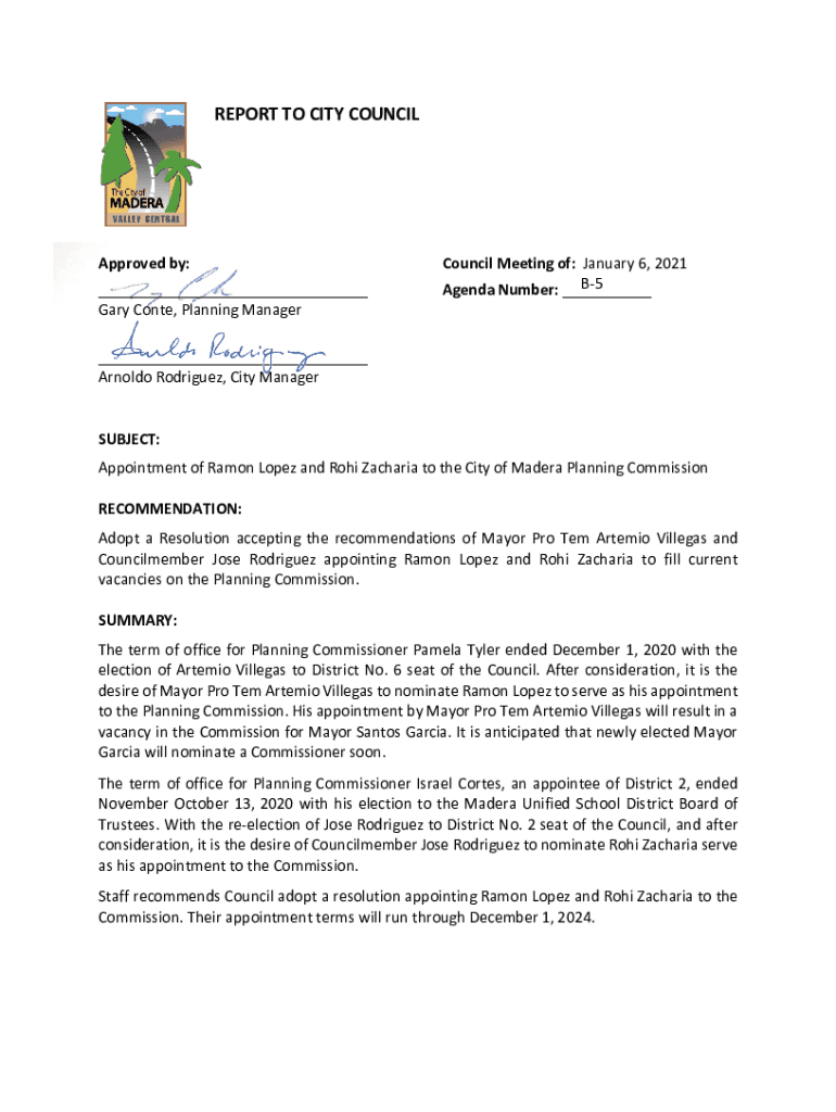 REPORT TO CITY COUNCILApproved by: ___ Gary Cone, Planning ManagerCouncil Meeting of: January 6, 2021 B5 Agenda Number: ______ Arnold Rodriguez, City Manager SUBJECT: Appointment of Ramon Lopez and