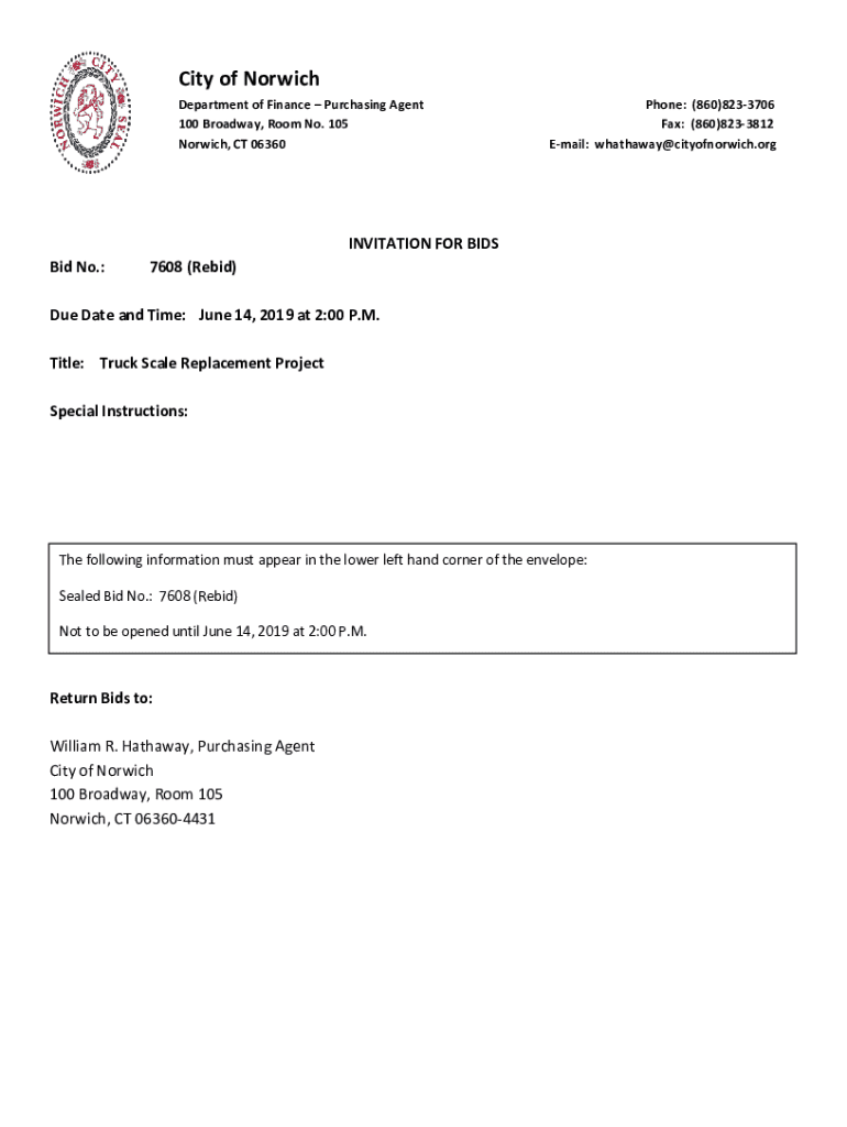 City of Norwich Department of Finance Purchasing Agent 100 Broadway, Room No. 105 Norwich, CT 06360Phone: (860)8233706 Fax: (860)8233812 Email: Hathaway×cityofnorwich.organization FOR BIDS Bid No.:7608
