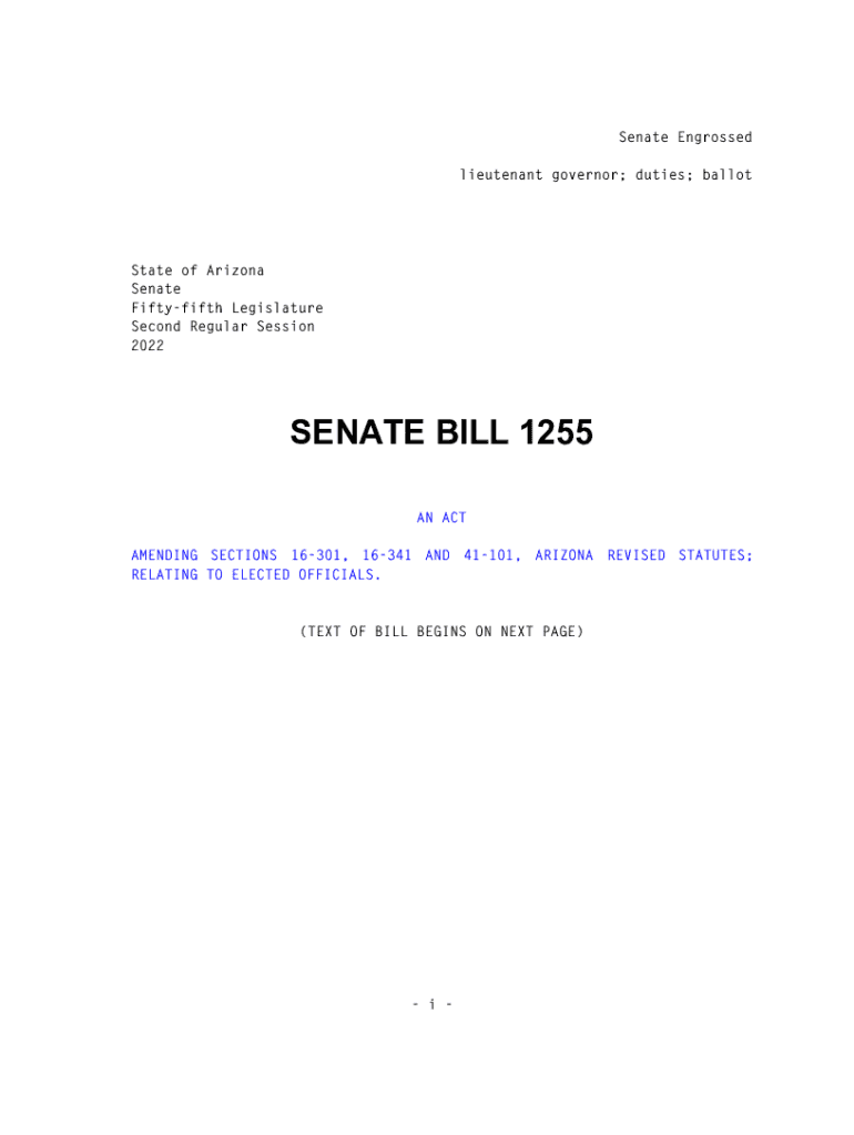 Senate Engrossed lieutenant governor; duties; Allstate of Arizona Senate Fifty fifth Legislature Second Regular Session 2022SENATE BILL 1255 AN ACT AMENDING SECTIONS 16301, 16341 AND 41101, ARIZONA
