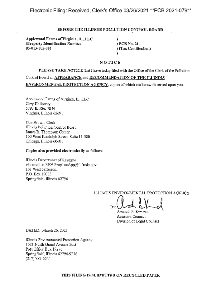 Electronic Filing: Received, Clerk\'s Office 03/26/2021 **PCB 2021079**BEFORE THE ILLINOIS POLLUTION CONTROL BOARD Applewood Farms of Virginia, IL, LLC (Property Identification Number 0501300300)))PCB
