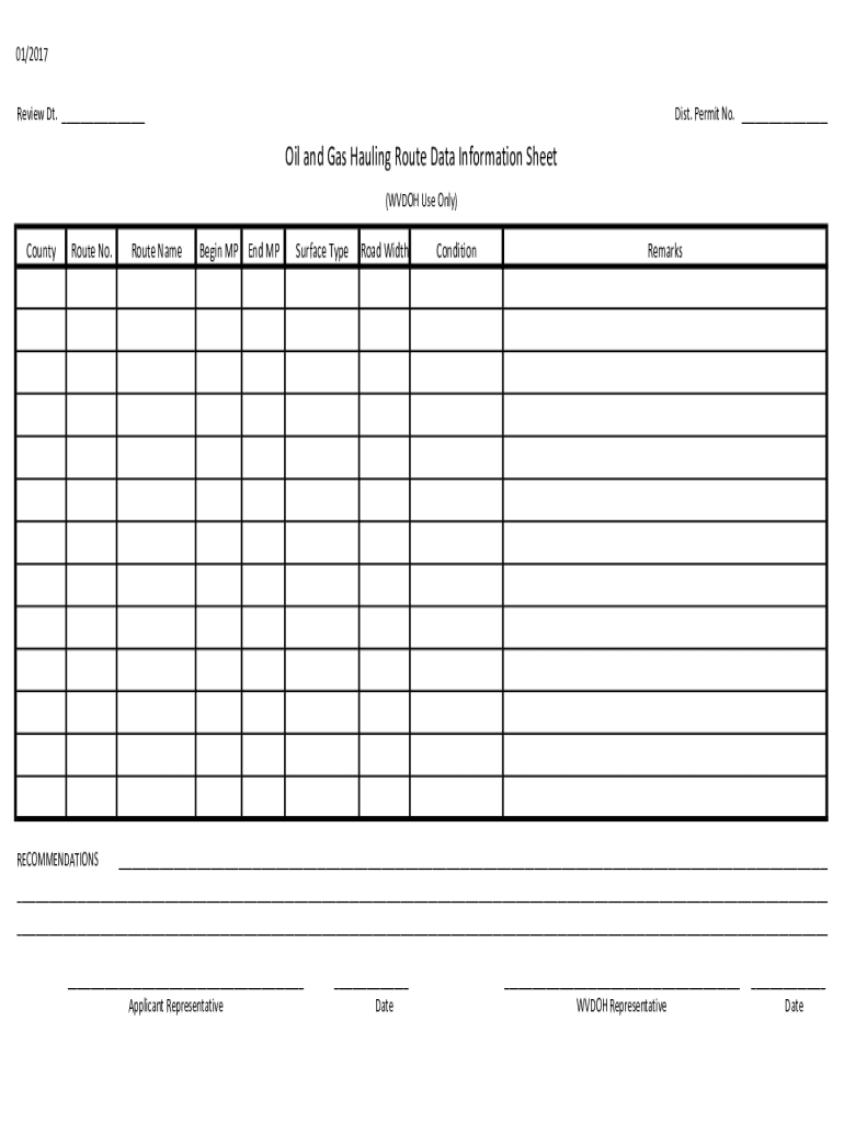 01/2017 Review DT. ___Dist. Permit No. ___Oil and Gas Hauling Route Data Information Sheet (WIDOW Use Only)CountyRoute No.RECOMMENDATIONSRoute Name Begin MP End Surface Typepad WidthConditionRemarks_________
