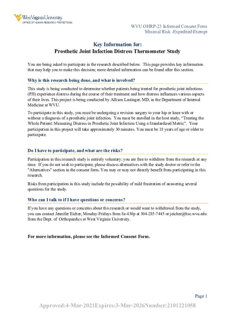 WSU OHRP23 Informed Consent Form Minimal Risk ExpeditedExemptKey Information for: Prosthetic Joint Infection Distress Thermometer Study You are being asked to participate in the research described