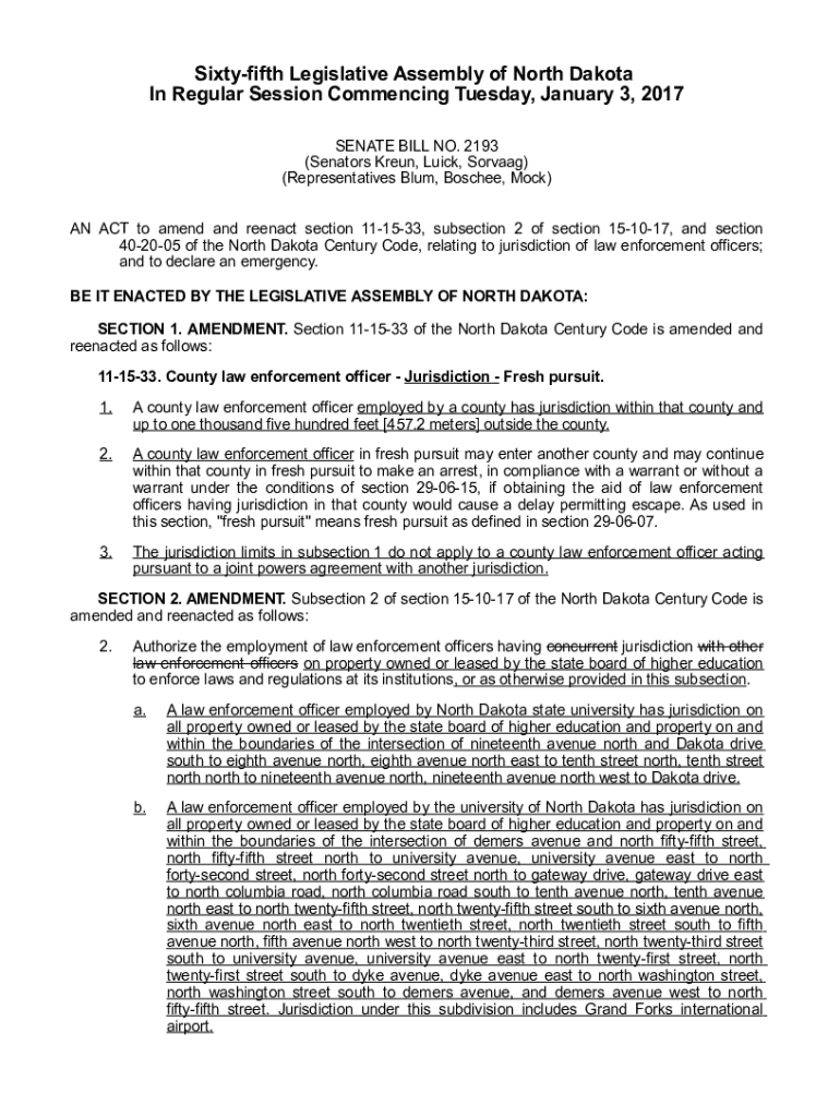 Sixty-fifth Legislative Assemblies of North Dakota In Regular Session Commencing Tuesday, January 3, 2017, SENATE BILL NO. 2193 (Senators Run, Quick, Rolvaag) (Representatives Blum, Bouchée, Mock)