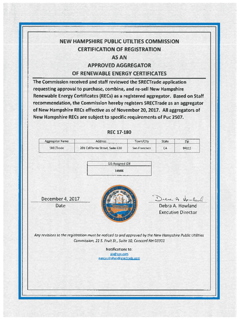 [NEW HAMPSHIRE PUBLIC UTILITIES COMMISSION CERTIFICATION OF REGISTRATION SAN APPROVED AGGREGATOR OF RENEWABLE ENERGY CERTIFICATES The Commission received and staff reviewed the Pre-trade application
