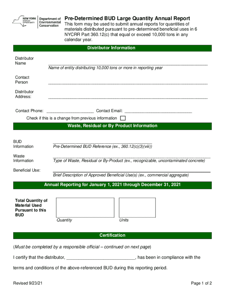 Predetermined BUD Large Quantity Annual Report This form may be used to submit annual reports for quantities of materials distributed pursuant to predetermined beneficial uses in 6 NY CRR Part 360.12(c)
