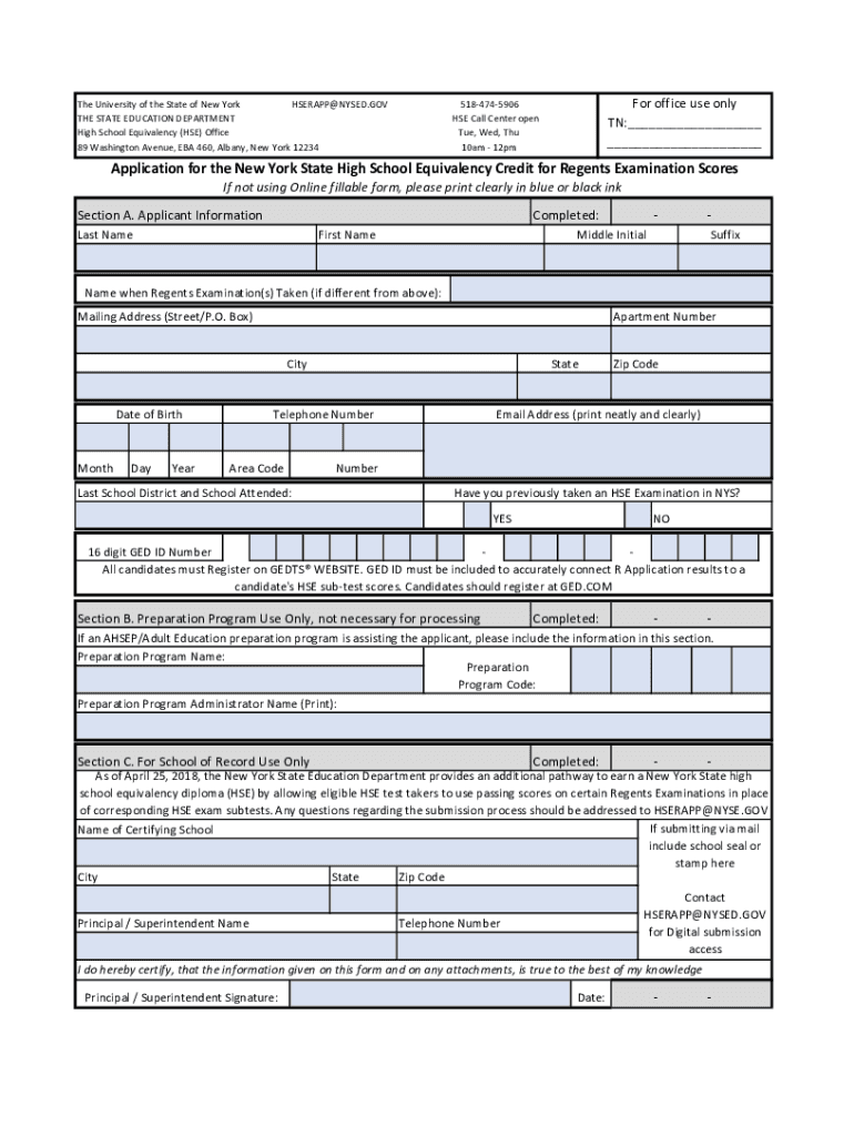 The University of the State of New York SERAPH×NOSED.GOV THE STATE EDUCATION DEPARTMENT High School Equivalency (HSE) Office 89 Washington Avenue, EBA 460, Albany, New York 12234For office use only