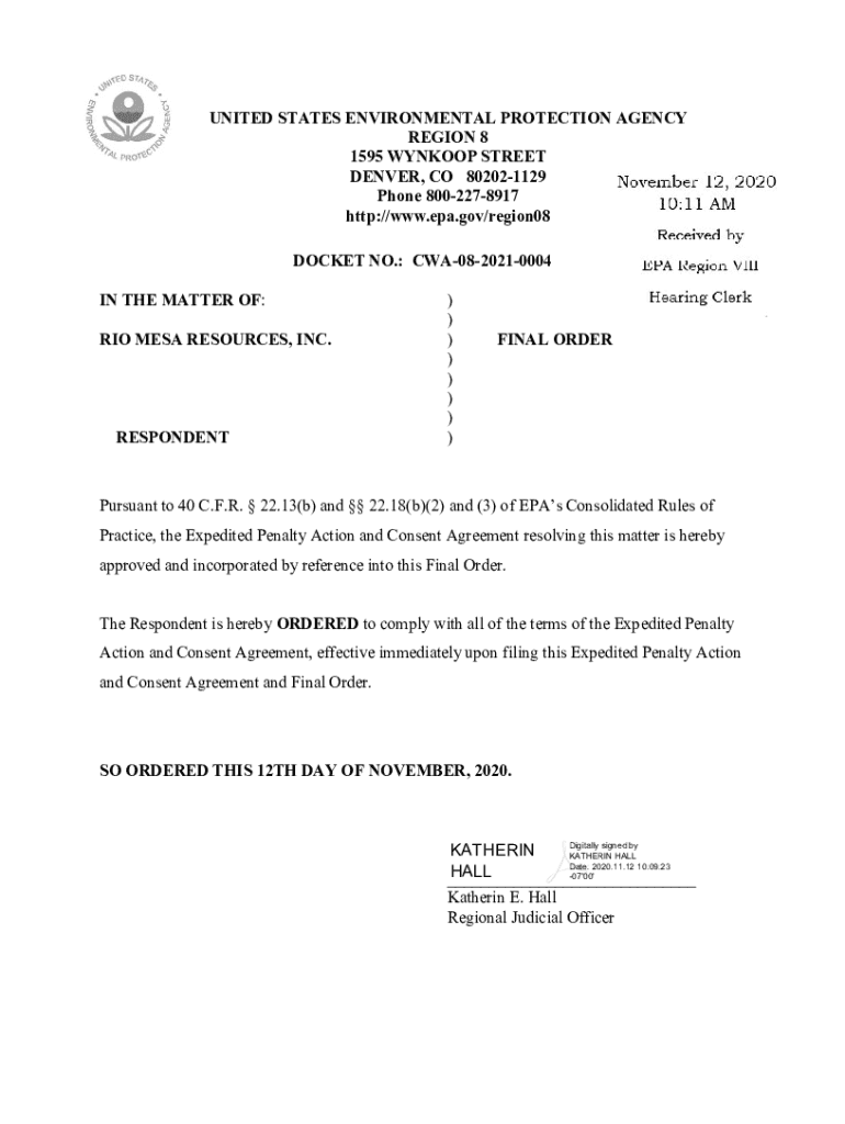 2UNITED STATES ENVIRONMENTAL PROTECTION AGENCY REGION 8 1595 SNOOP STREET DENVER, CO 802021129 Phone 8002278917 http://www.epa.gov/region08 DOCKET NO.: CWA0820210004IN THE MATTER OF: RIO MESA RESOURCES,