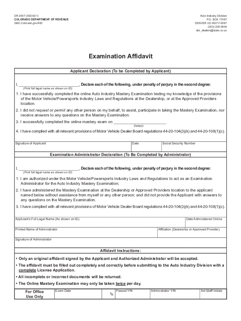 DR 2097 (05/28/21) COLORADO DEPARTMENT OF REVENUE SBG.Colorado.gov/AIDAuto Industry Division P.O. BOX 17087 DENVER CO 802170087 (303) 2055604 for×dealers×state.co.examination Affidavit Applicant