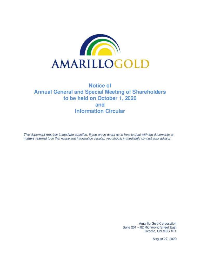 Notice of Annual General and Special Meeting of Shareholders to be held on October 1, 2020, and Information Circulates document requires immediate attention. If you are in doubt as to how to deal