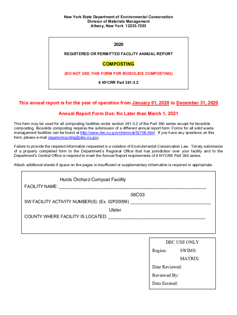 New York State Department of Environmental Conservation Division of Materials Management Albany, New York 12233725320 REGISTERED OR PERMITTED FACILITY ANNUAL REPORTCOMPOSTING (DO NOT USE THIS FORM