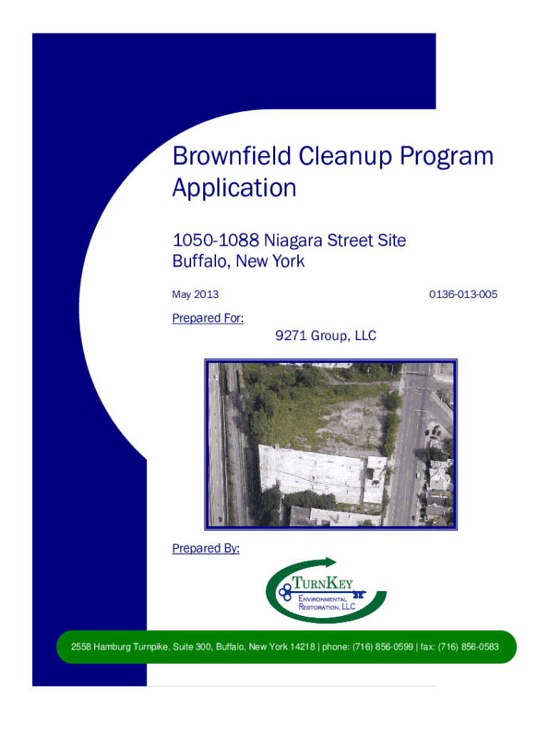 Brownfield Cleanup Program Application 10501088 Niagara Street Site Buffalo, New York May 20130136013005Prepared For:9271 Group, Prepared By:2558 Hamburg Turnpike, Suite 300, Buffalo, New York 14218