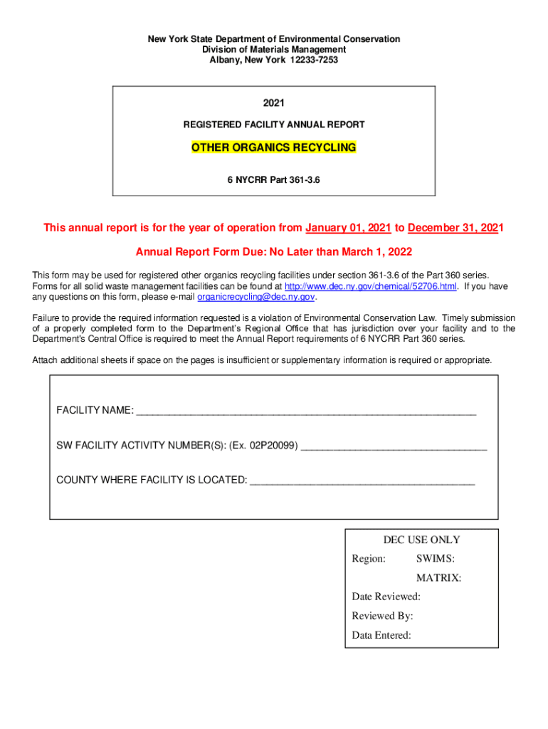 New York State Department of Environmental Conservation Division of Materials Management Albany, New York 1223372532021 REGISTERED FACILITY ANNUAL REPORTER ORGANICS RECYCLING 6 NY CRR Part 3613.6This