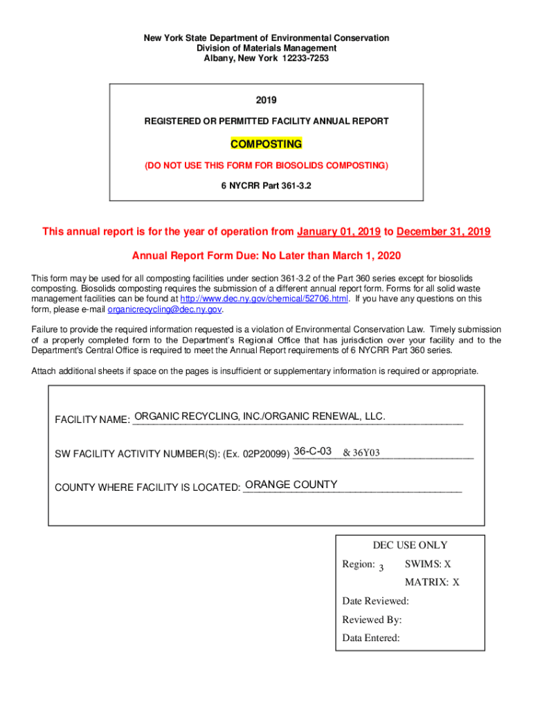 New York State Department of Environmental Conservation Division of Materials Management Albany, New York 1223372532019 REGISTERED OR PERMITTED FACILITY ANNUAL REPORTCOMPOSTING (DO NOT USE THIS FORM