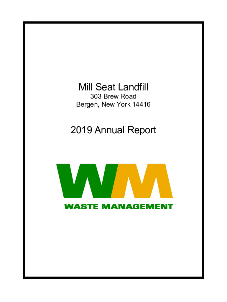 Mill Seat Landfill 303 Brew Road Bergen, New York 144162019 Annual Report Mill Seat Landfill 2019 Annual Report TABLE OF CONTENTS1) NYSE Division of Solid Waste Annual Report Form 2) Annual Leachate