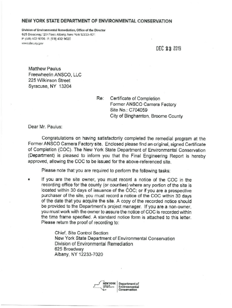 NEW YORK STATE DEPARTMENT OF ENVIRONMENTAL CONSERVATION Division of Environmental Remediation, Office of the Director 625 Broadway, 12th Flo.o r, Albany, New York 122337011 P: (518) 4029706 I F: 518)