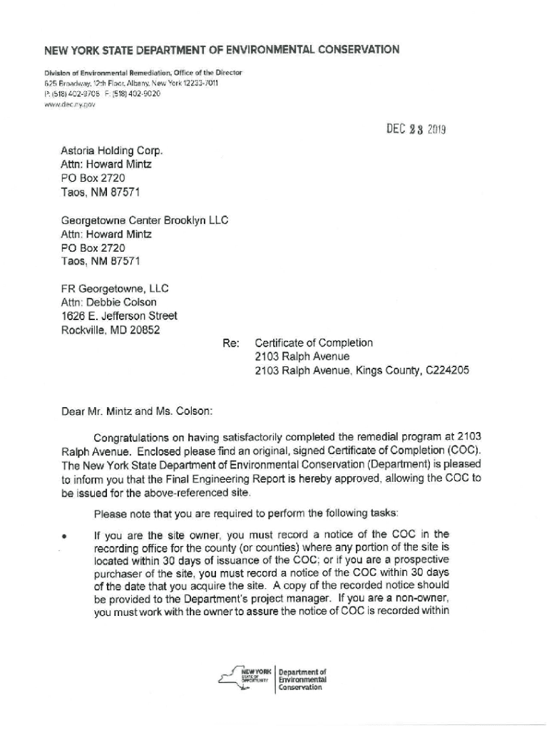 NEW YORK STATE DEPARTMENT OF ENVIRONMENTAL CONSERVATION Division of Environmental Remediation, Office of the Director6 25 Broadway, 12th Floor, A Albany, New York 122337011 P: (518) 4029706 I F: (518)