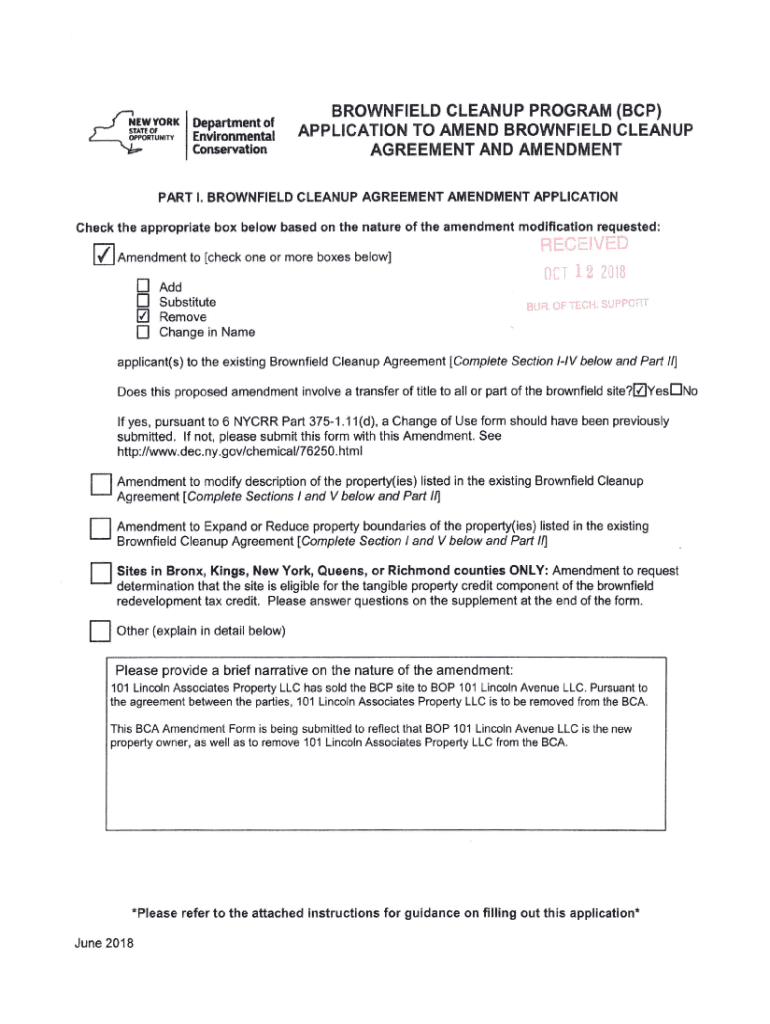 4WYORK t N1TYDepartment of Environmental ConservationBROWNFIELD CLEANUP PROGRAM (BCP) APPLICATION TO AMEND BROWNFIELD CLEANUP AGREEMENT AND AMENDMENTPART I. BROWNFIELD CLEANUP AGREEMENT AMENDMENT
