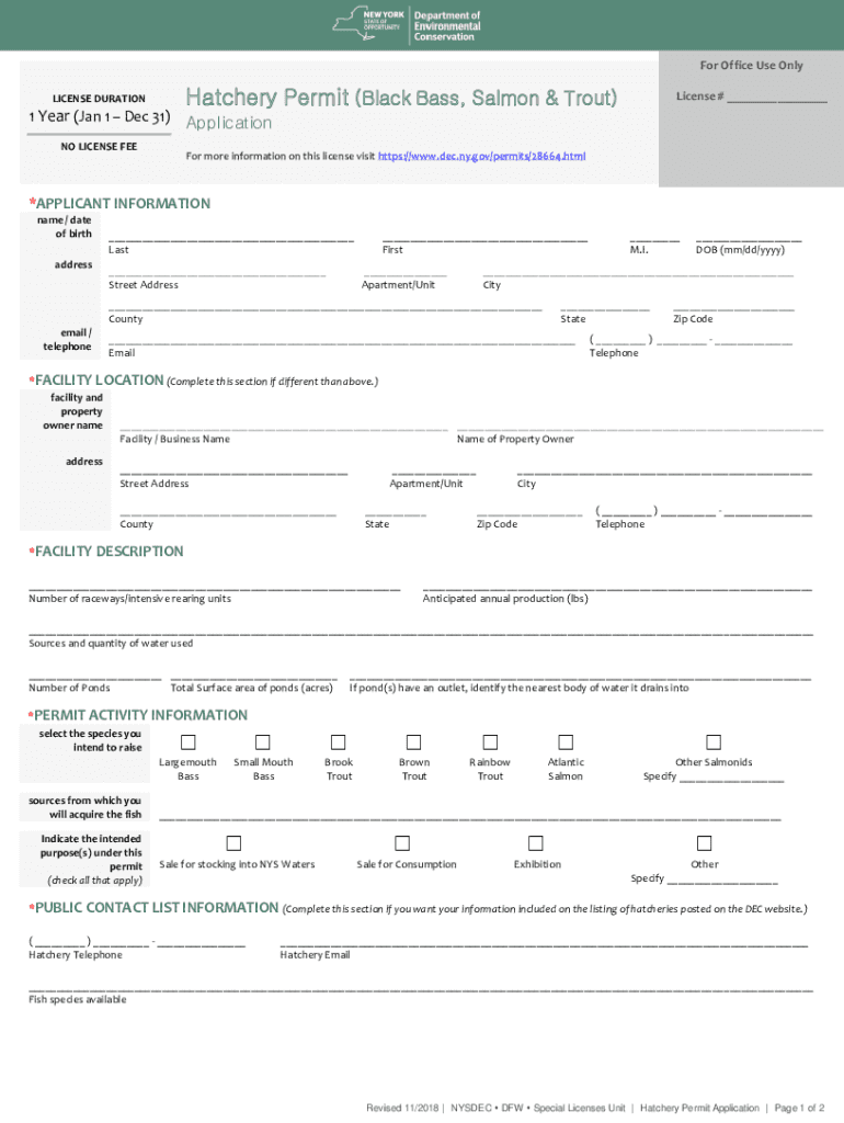 For Office Use OnlyHatchery Permit (Black Bass, Salmon & Trout)LICENSE DURATIONLicense # ___1 Year (Jan 1 Dec 31) Application NO LICENSE Feeder more information on this license visit https://www.dec.ny.gov/permits/28664.html×APPLICANT