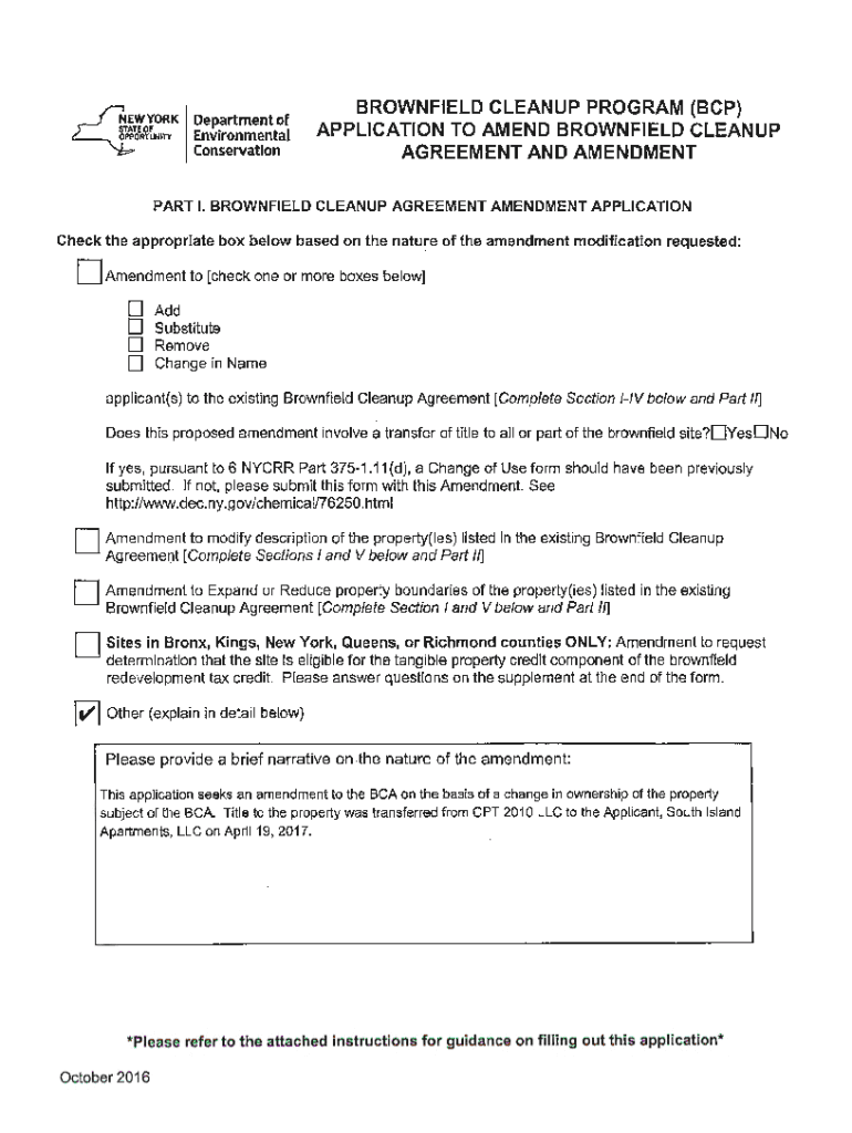 4WYORK1i×N1TYDepartment of EnvironmentalConservationBROWNFIELD CLEANUP PROGRAM (BCP) APPLICATION TO AMEND BROWNFIELD CLEANUP AGREEMENT AND AMENDMENTPART I. BROWNFIELD CLEANUP AGREEMENT AMENDMENT