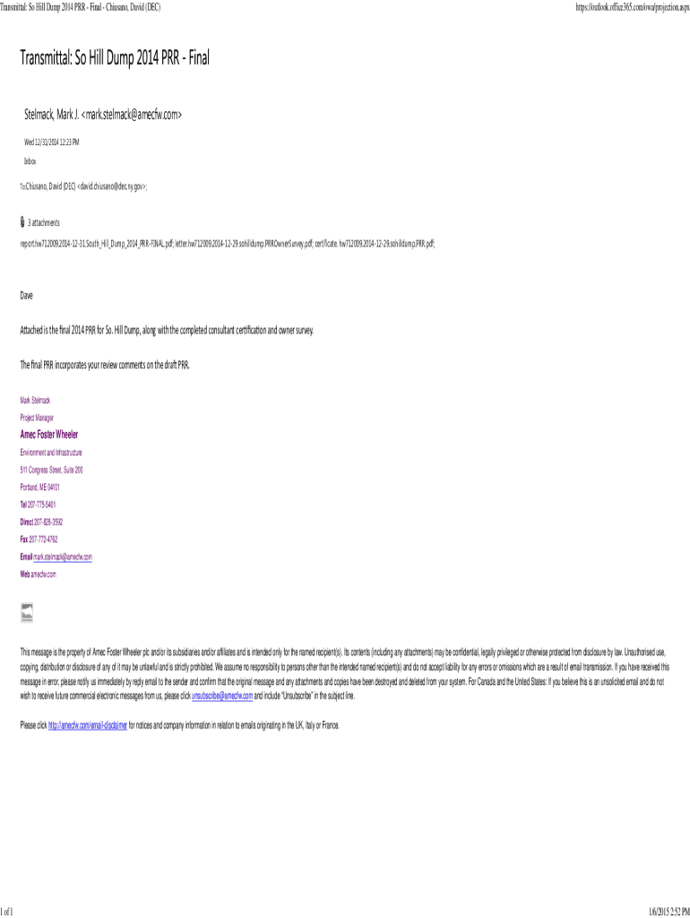 Transmittal: So Hill Dump 2014 PRR Final Chicano, David (DEC)1 of 1https://outlook.office365.com/owa/projection.aspxStelmack, Mark J. mark. Stack×amecfw.com Wed 12/31/2014 12:23 PM Inbox To:Chicano,