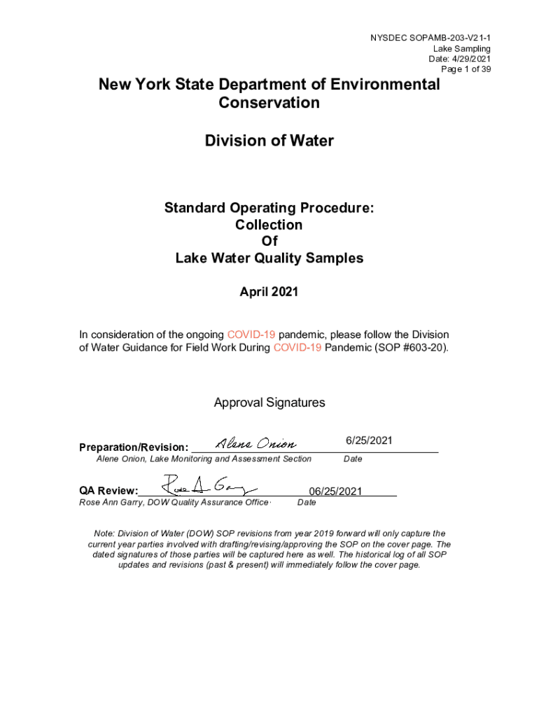NYSE SOPAMB203V211 Lake Sampling Date: 4/29/2021-Page 1 of 39New York State Department of Environmental Conservation Division of WaterStandard Operating Procedure: Collection Of Lake Water Quality