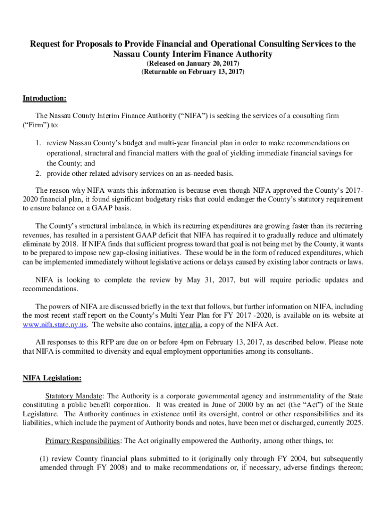 Request for Proposals to Provide Financial and Operational Consulting Services to the Nassau County Interim Finance Authority (Released on January 20, 2017) (Returnable on February 13, 2017)Introduction: