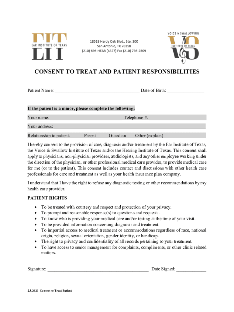 CONSENT TO TREAT AND PATIENT RESPONSIBILITIES Patient Name: ___ Date of Birth: ___If the patient is a minor, please complete the following: Your name: ___ Telephone #: ___ Your address: ___ Relationship