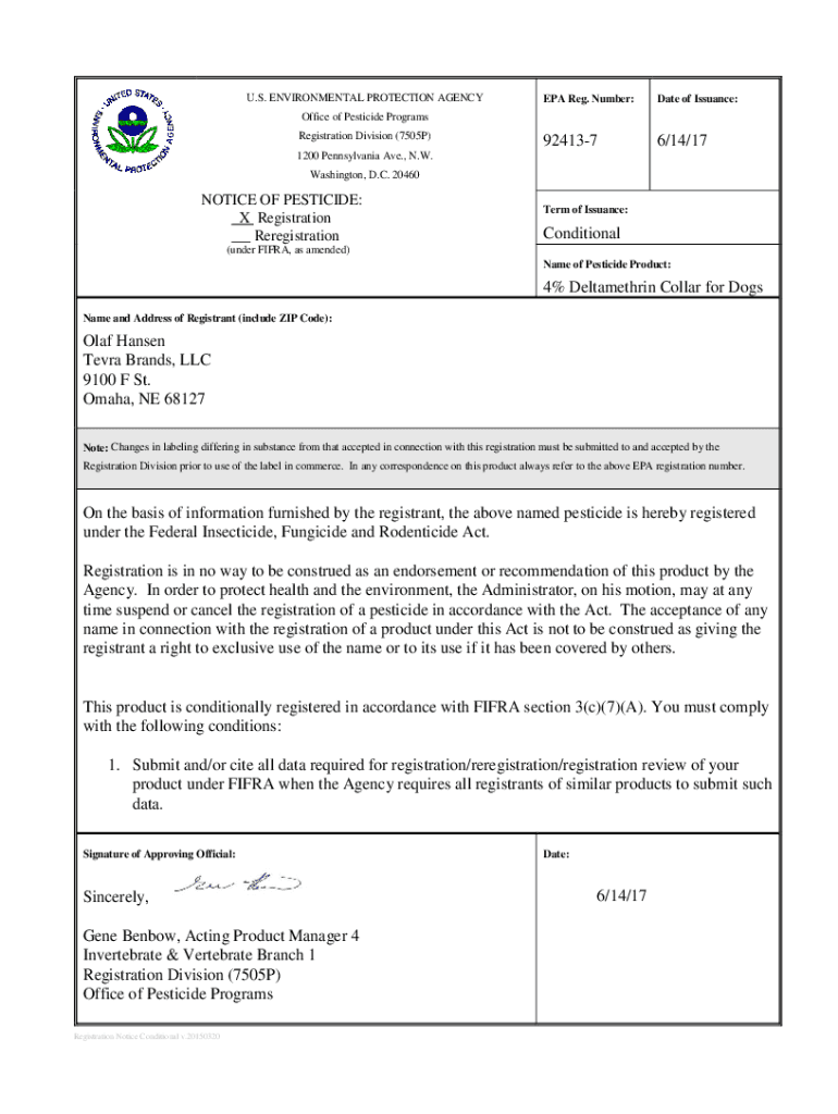 U.S. ENVIRONMENTAL PROTECTION AGENCY EPA Reg. Number:Date of Issuance:9241376/14/17Office of Pesticide Programs Registration Division (7505P) 1200 Pennsylvania Ave., N.W. Washington, D.C. 20460NOTICE