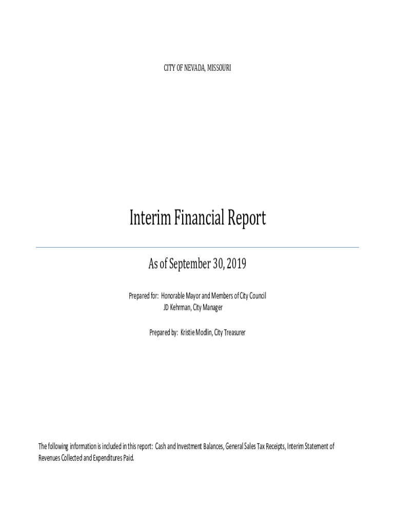 CITY OF NEVADA, MISSOURIInterim Financial Report As of September 30, 2019Prepared for: Honorable Mayor and Members of City Council JD German, City Manager Prepared by: Kristie Modern, City Treasurer