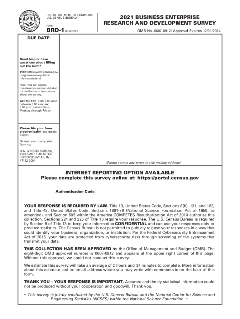 U.S. DEPARTMENT OF COMMERCE U.S. CENSUS BUREAU FORMBRD1 (01052022)2021 BUSINESS ENTERPRISE RESEARCH AND DEVELOPMENT SURVEY OMB No. 06070912: Approval Expires 12/31/2024DUE DATE:Need help or have questions