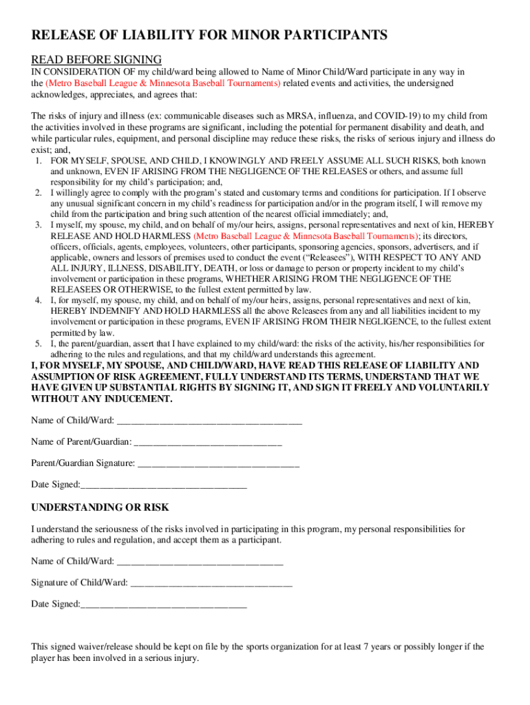 RELEASE OF LIABILITY FOR MINOR PARTICIPANTS READ BEFORE SIGNING IN CONSIDERATION OF my child/ward being allowed to Name of Minor Child/Ward participate in any way in the (Metro Baseball League & Minnesota