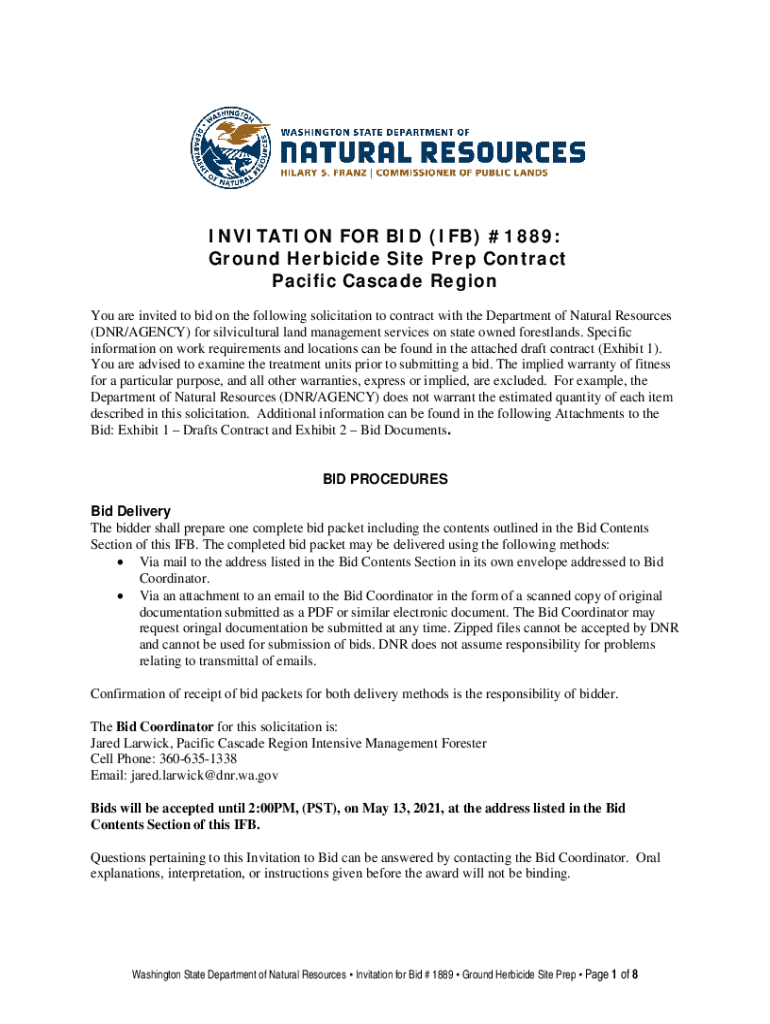 INVITATION FOR BID (IF) #1889: Ground Herbicide Site Prep Contract Pacific Cascade Region You are invited to bid on the following solicitation to contract with the Department of Natural Resources