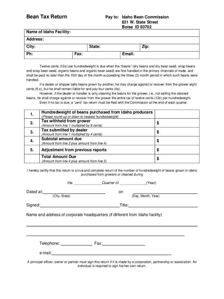 Bean Tax Return to: Idaho Bean Commission 821 W. State Street Boise ID 83702Name of Idaho Facility: Address: City:State:pH:Fax:Zip: Email:Twelve cents (12) per hundredweight is due when the beans
