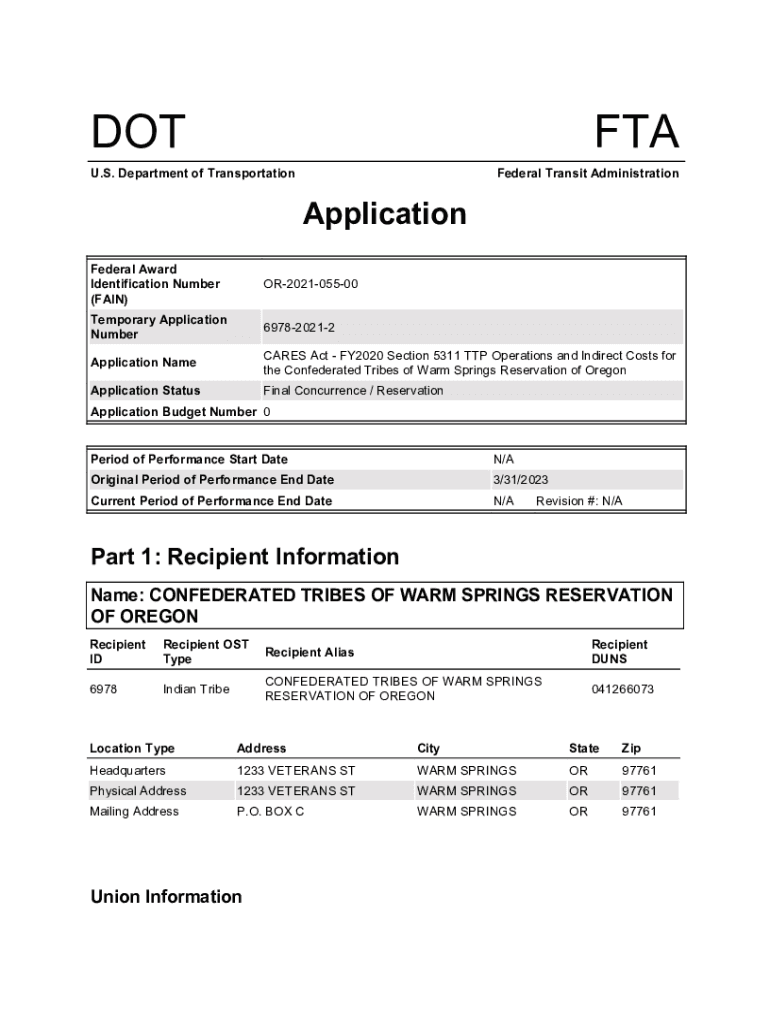 DOTTED. S. Department of Transportation Federal Transit AdministrationApplication Federal Award Identification Number (FAIN)OR202105500Temporary Application Number697820212Application Namesakes Act