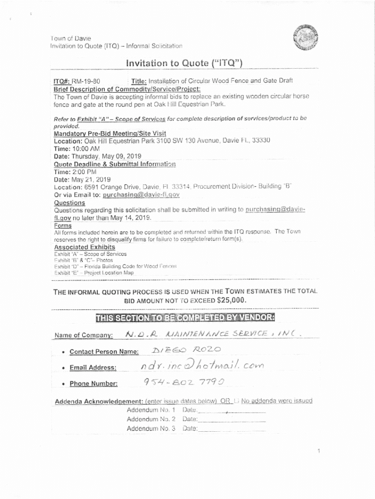\'Town of Davie invitation to Quote (Ltd)informal Sclicitationlnvitation to Quote (\” liq\”) Title: installation of Circular Wood Fence and Gate Draft IT#: RM1980 Brief Descry ion of Commodity/Service/Pro