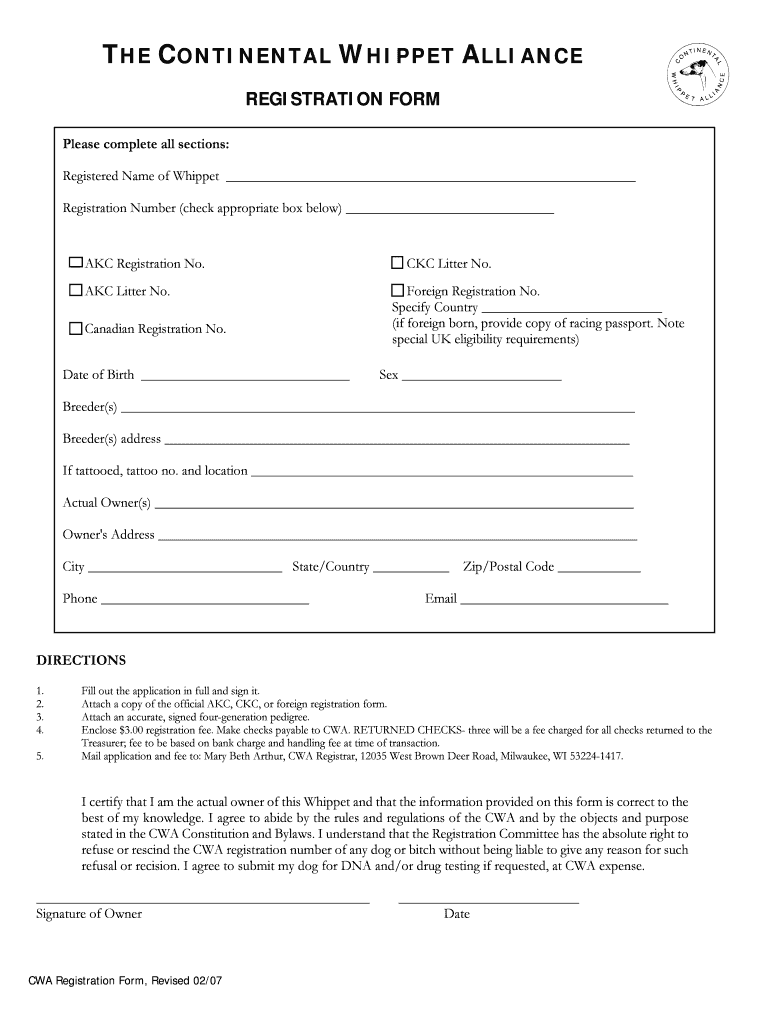 Get the free F:CWAforms2007 CWA registration form - Continental Whippet ... - racingforfun shawwe...