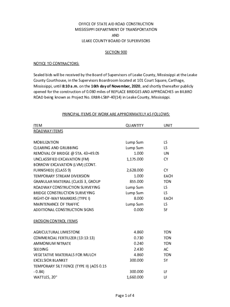 OFFICE OF STATE AID ROAD CONSTRUCTION MISSISSIPPI DEPARTMENT OF TRANSPORTATION AND LEAVE COUNTY BOARD OF SUPERVISORS SECTION 900 NOTICE TO CONTRACTORS: Sealed bids will be received by the Board of
