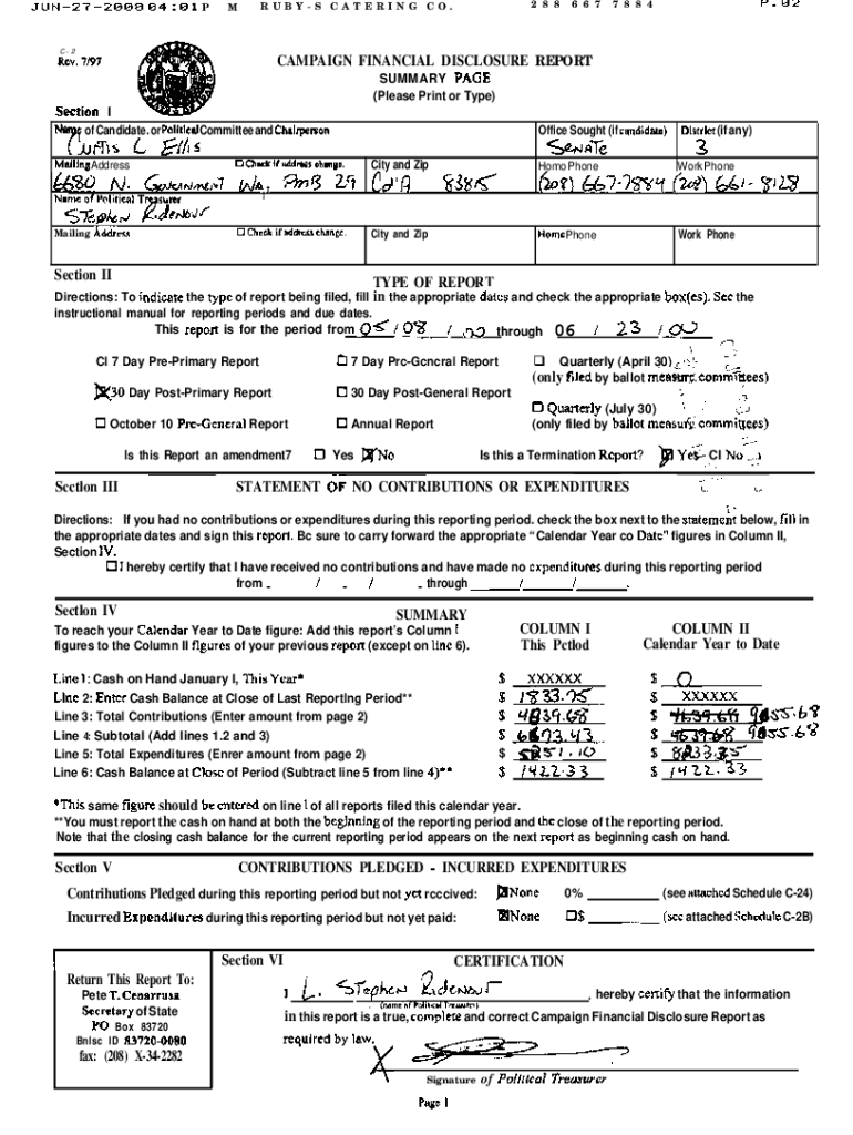 JUN272888 84:81 P2 8 8R U B Y S C A T E R I N G C O.MC2 Rev. 11976 6 77 8 8 4CAMPAIGN FINANCIAL DISCLOSURE REPORT SUMMARY PAGE (Please Print or Type)Section I N of Candidate. Or Political Committee