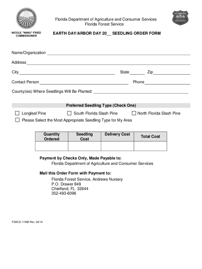 Florida Department of Agriculture and Consumer Services Florida Forest Service NICOLE \” NIKKI\” FRIED COMMISSIONEREARTH DAY/ARBOR DAY 20__ SEEDLING ORDER Forename/Organization Address CityStateContact