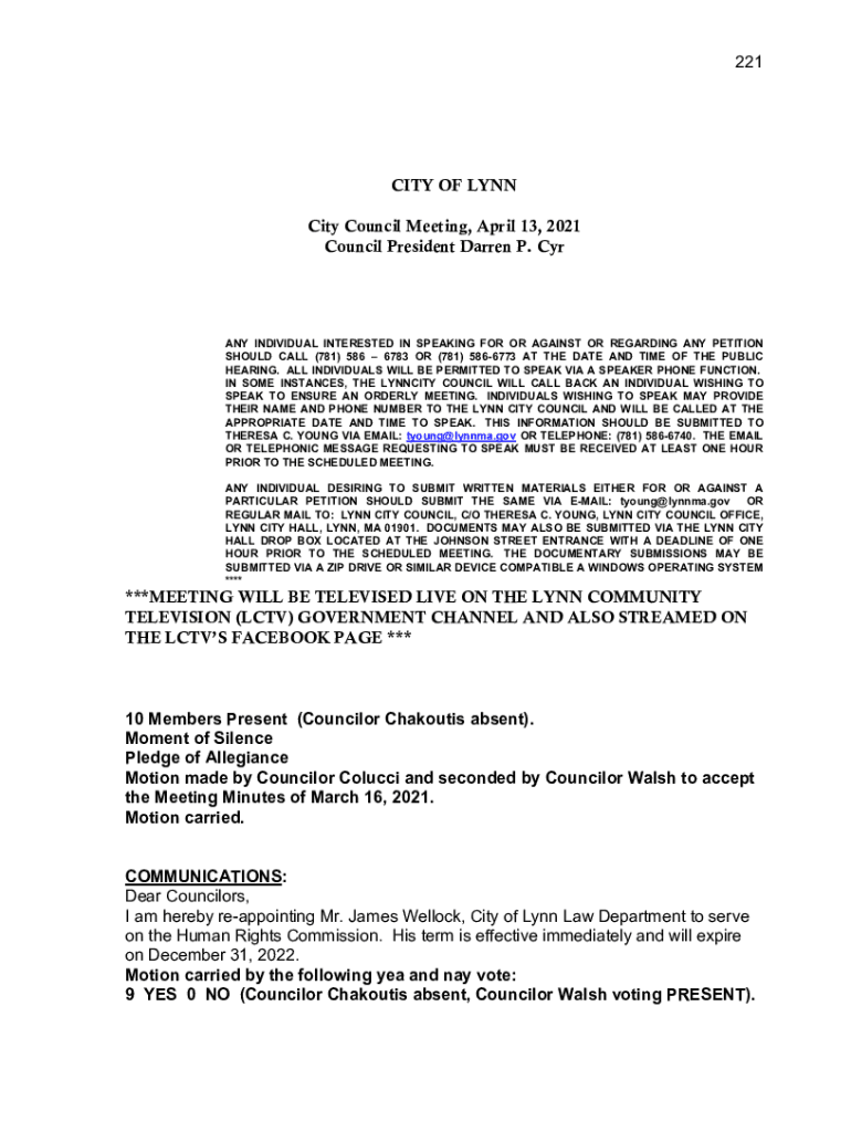 221CITY OF LYNN City Council Meeting, April 13, 2021, Council President Darren P. Cyrano INDIVIDUAL INTERESTED IN SPEAKING FOR OR AGAINST OR REGARDING ANY PETITION SHOULD CALL (781) 586 6783 OR (781)