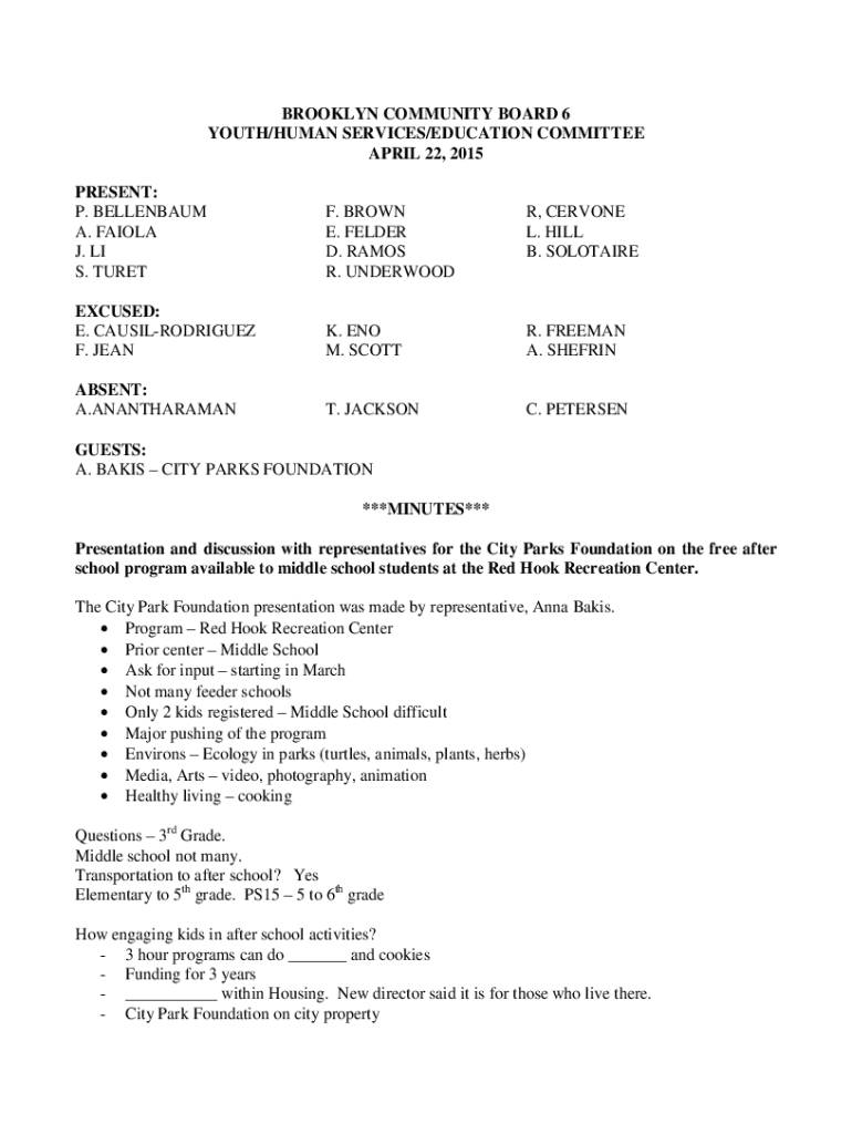 BROOKLYN COMMUNITY BOARD 6 YOUTH/HUMAN SERVICES/EDUCATION COMMITTEE APRIL 22, 2015, PRESENT: P. BELLEAU A. FAI OLA J. LI S. TURRET. BROWN E. ELDER D. RAMOS R. UNDERWOOD, CRONE L. HILL B. SOLOTAIREEXCUSED:
