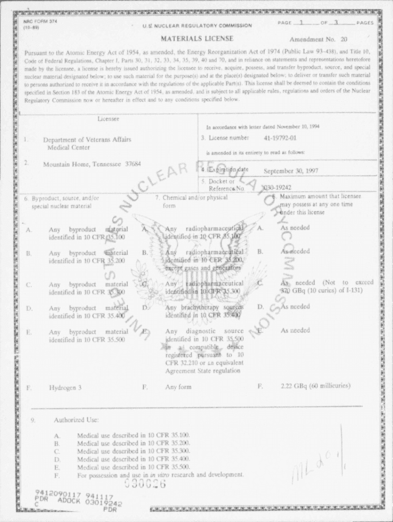 , ×4 m,., * |HRC FORM 374MATERIALS License 31PAGEU.fl. NUCLEAR REGULATORY COMMISSION\'0044PAGESAmendment No. 20\'Pursuant to the Atomic Energy Act of 1954, as amended, the Energy Reorganization