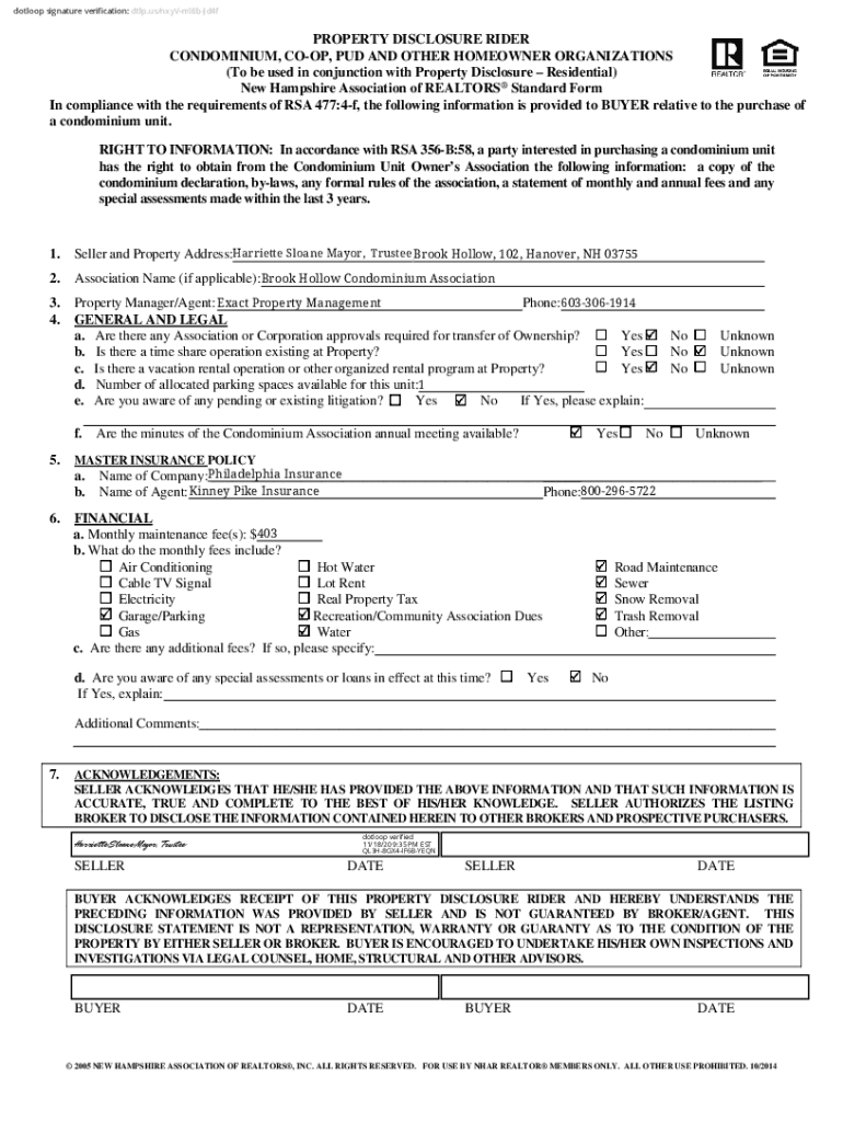 Dot loop signature verification: dtlp.us/nxyVml8bJd4fPROPERTY DISCLOSURE RIDER CONDOMINIUM, COOP, PUD AND OTHER HOMEOWNER ORGANIZATIONS (To be used in conjunction with Property Disclosure Residential)