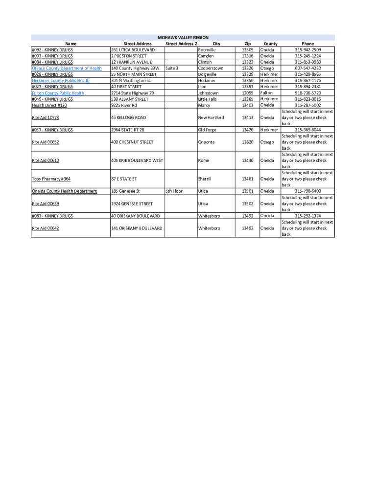 Name #092 KINNEY DRUGS #003 KINNEY DRUGS #084 KINNEY DRUGS Oswego County Department of Health #028 KINNEY DRUGS Perkier County Public Health #027 KINNEY DRUGS Fulton County Public Health #049 KINNEY