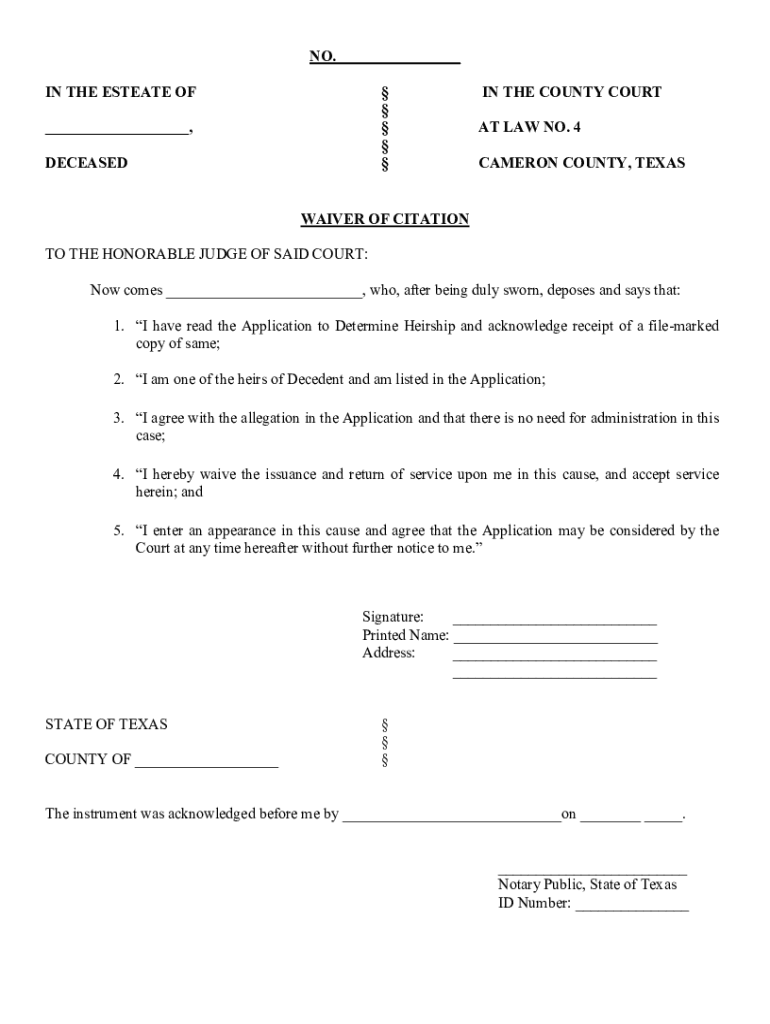 NO. ___ IN THE ESTATE OF ___, DECEASE DIN THE COUNTY COURT AT LAW NO. 4 CAMERON COUNTY, TEXASWAIVER OF CITATION TO THE HONORABLE JUDGE OF SAID COURT: Now comes ___, who, after being duly sworn, deposes